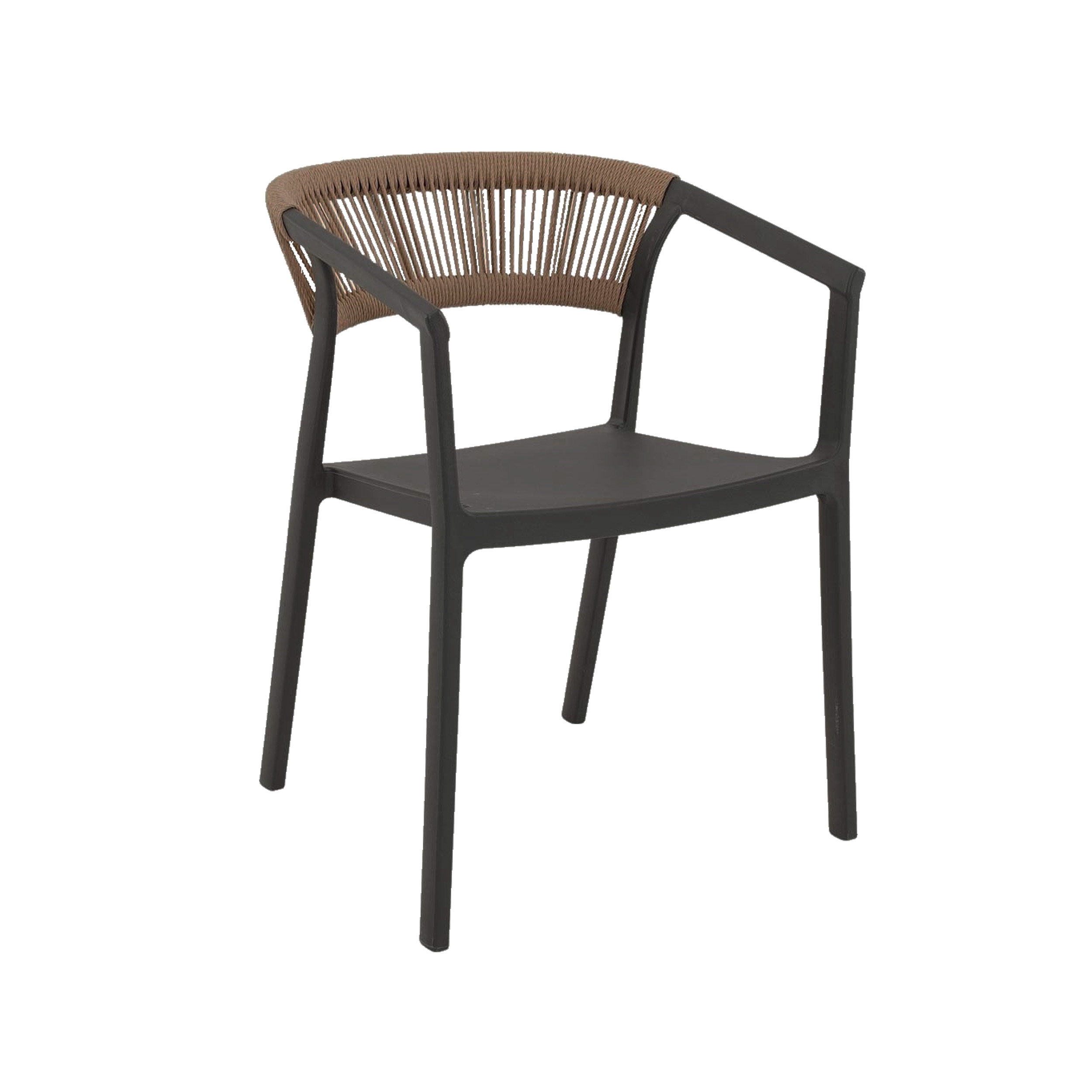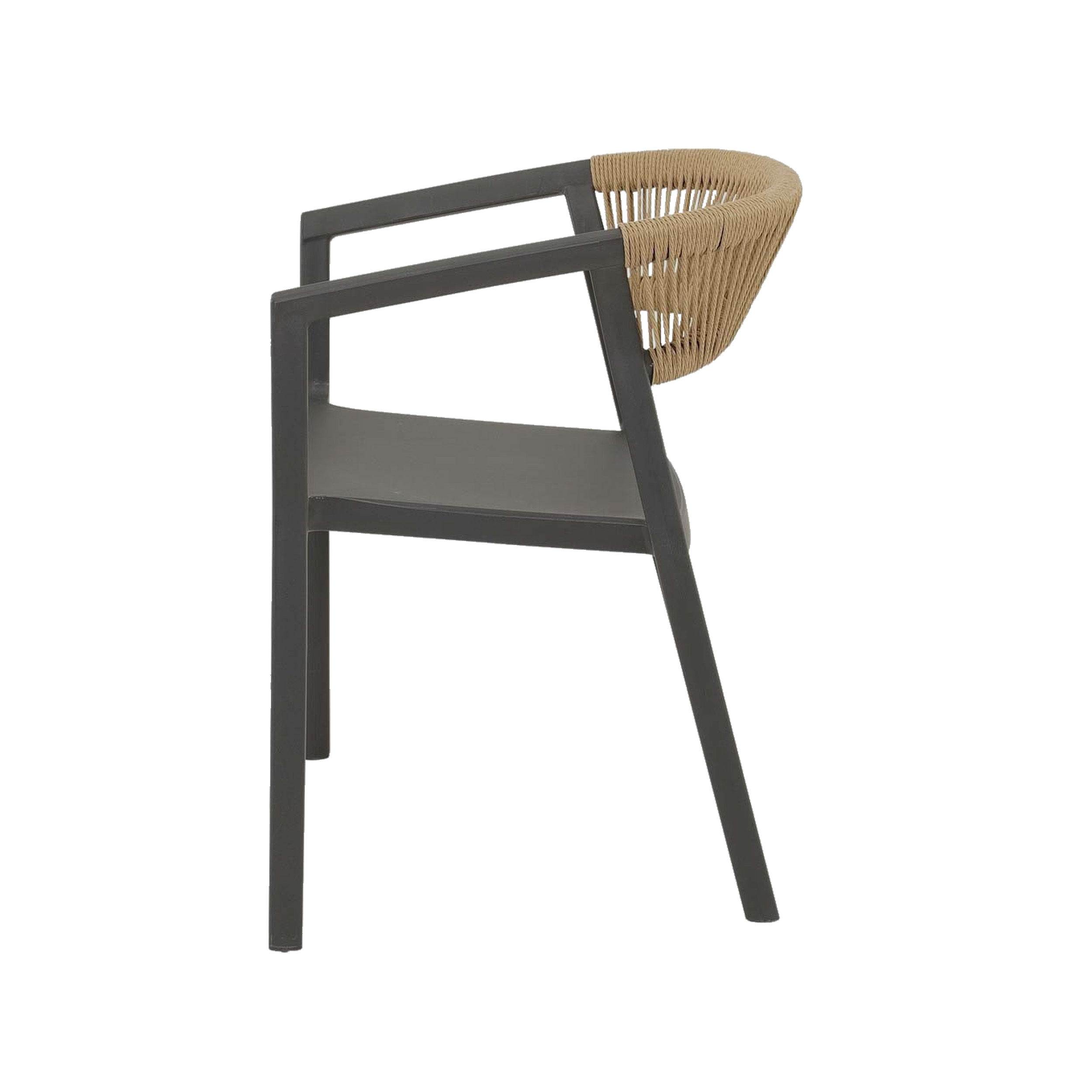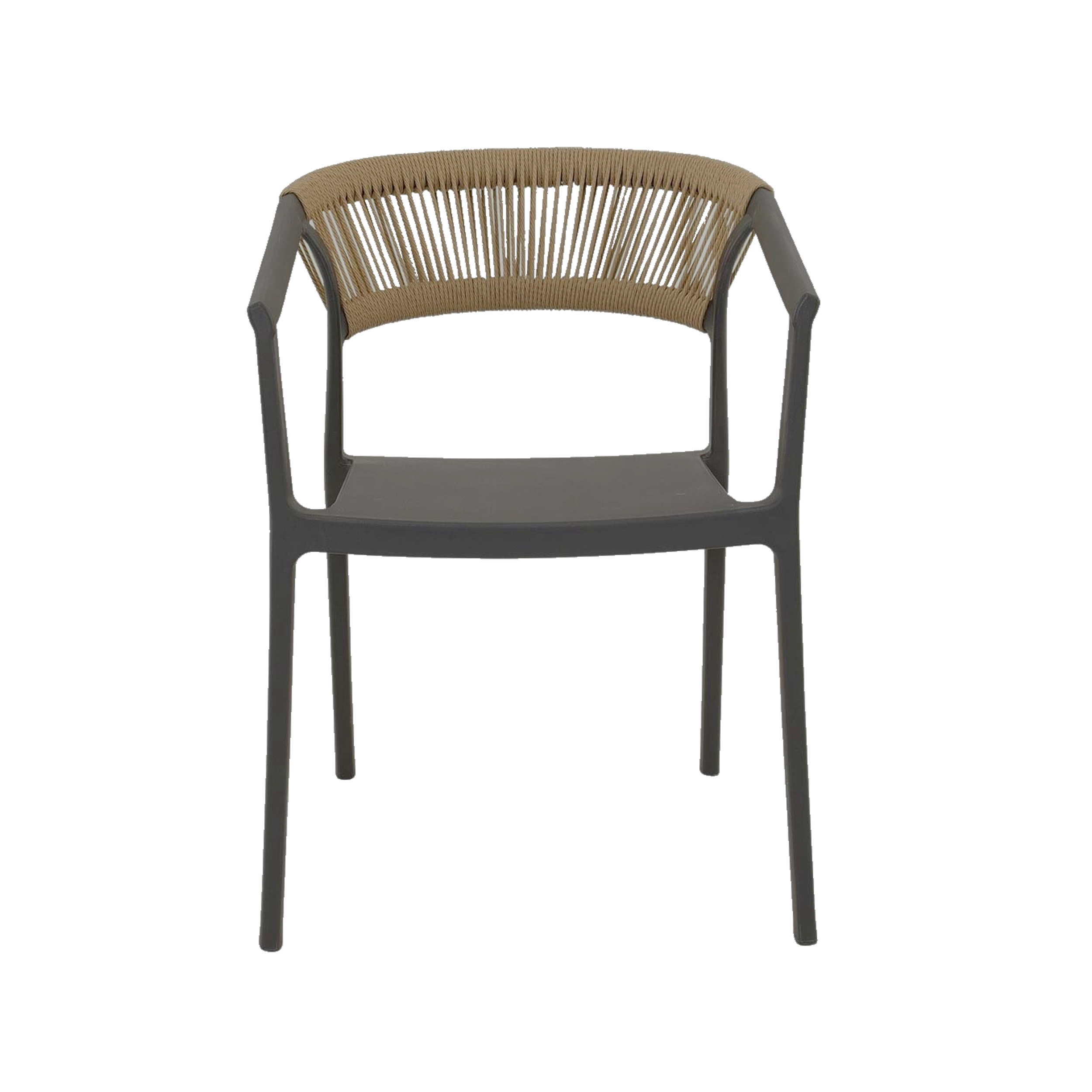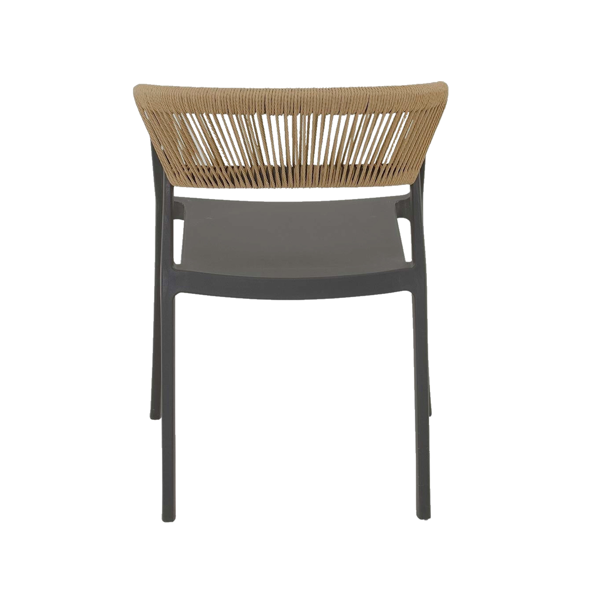 Horeca terrasstoel met een stijlvol en functioneel ontwerp, perfect voor buitengebruik. De stoel heeft een stevig frame van kunststof dat weerbestendig en duurzaam is, ideaal voor intensief gebruik in horecagelegenheden. De rugleuning is voorzien van prachtig zand kleurig vlechtwerk, wat de stoel een elegante en moderne uitstraling geeft. Dit vlechtwerk biedt niet alleen comfort, maar voegt ook een warme, natuurlijke touch toe aan het strakke, industriële frame. De stoel is lichtgewicht, makkelijk te verplaatsen, en stapelbaar, wat handig is voor opslag in drukke horecagelegenheden.